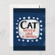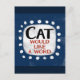 An irreverent and cute typographic animal design that says "Cat Would Like A Word". It features black and red text on a white rectangle with funky, playful white dots surrounding it, all on a blue background.