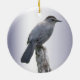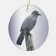 This ornament features a Grey Catbird perched on a fence post.. He is a grey bird with a black cap and bright rusty feathers under the tail. Grey Catbirds are relatives of mockingbirds and thrashers, and they share that group’s vocal abilities, copying the sounds of other species and stringing them together to make their own song. Their call sounds like the meow of a cat.