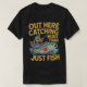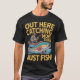 This black t-shirt features a cartoon illustration of a person sitting in a small boat, reeling in a very large and colourful fish. The text above the illustration reads "OUT HERE CATCHING" in a bold yellow font, with "MORE THAN" in a smaller yellow font to the right. Below the illustration, the phrase "JUST FISH" is displayed in a large, bold yellow font. This design playfully suggests that fishing offers more than just catching fish, perhaps referring to experiences, memories, or peace.