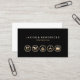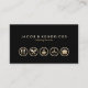 This catering services business card features a jet black background. Five gold icons related to catering appear on the lower half of the card, with your business name and tagline or text appearing in bold on the upper half. Your contact details appear on the back of the card. The small icons create a very impressive professional look.