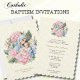 Featuring a beautiful Catholic custom designed Baptism Christening Floral invitation with the Blessed Mother holding Jesus in her arms inlaid in a blue and pink floral wreath. with white lace background. All text and fonts may be modified.