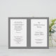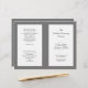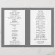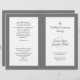 Dark grey and white wedding ceremony programs with text template areas to accommodate a longer, Catholic ceremony. Black elegant font is printed over white panels on the front and back. Fold in half after receiving which will put the scripture and thank-you message on the back of the program. On the reverse (which will be the centre pages of the program) include the order of the ceremony and the wedding party section to list all the people involved in making the day so special. Although this sample program is set up for a Catholic service, use it for any type of wedding. Add spaces to make the wording fit better.