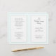 Folded wedding program template for a catholic ceremony. This layered-look program contains white panels over pale green. Each page has space for lots of text to accommodate a traditional church marriage ceremony. The last page (back of program) includes a section for scripture (sample is "love is patient" from 1 Corinthians) and a thank-you message from the bride and groom.