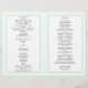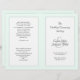Folded wedding program template for a catholic ceremony. This layered-look program contains white panels over pale mint green colour. Each page has space for lots of text to accommodate an involved ceremony. The last page (back of program) includes a section for scripture (sample is "love is patient" from 1 Corinthians) and a message from the bride and groom.