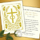 A timeless Catholic wedding keepsake beautifully featuring a gold-embossed cross with interlocking wedding bands, framed by grape clusters and symbolic foliage representing the fruitful union of Holy Matrimony. The front of this sacred design recalls the dignity of the sacrament, while the reverse offers a prayerful reflection and personalisation with the couple’s names and wedding date. A reverent memento for Catholic nuptials, ideal for distributing at the Nuptial Mass or as a lasting token of sacramental grace.