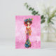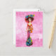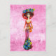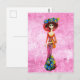 Catrina W/Red Dress & Blue Flowers On Pink Washed Postcard