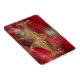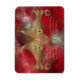 A stylised cat face made of glowing gold curves and curlicues, with wide green-gold eyes, against a red fractal background.