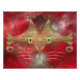 A stylised cat face made of glowing gold curves and curlicues, with wide green-gold eyes, against a red fractal background.
