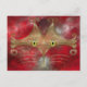 A stylised cat face made of glowing gold curves and curlicues, with wide green-gold eyes, against a red fractal background.