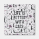 A cute and fun pattern for the cat lover in your life. The design features cat silhouettes in black, trees, flowers, birds and moths all in a graphic style on a platinum white background. And the text: Life is better with cats which you can change to add your own personal touch