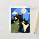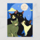 Postcard in In an illustration of four cats on the prowl, with bright eyes, are gathered under a night sky, featuring a full moon and stars. The sky is a deep blue, dotted with fluffy clouds.