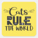 Fun and lovely modern bright yellow sticker featuring the words "Cats rule the world", decorated with white whiskers, cat scratches, a tiny mouse, and a little paw.