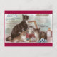 A mother cat is looking at a birdcage while her three kittens play in a box that held cologne, perfume and some sort of weird mouthwash in this Victorian trade card from 1894.
