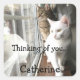 Cute grey tabby cat and adorable white cat sitting together by the window looking outside, and the messages of “Thinking of you..."