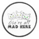 We're All Mad Here text and drawing of three funny cat faces with yellow and green eyes. Round products and souvenirs