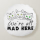 We're All Mad Here text and drawing of three funny cat faces with yellow and green eyes. Funny round pillow for anyone. Beautiful cats bring with them good dreams and perfect rest to you at night or during the daytime nap. Have a good rest!