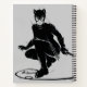 This striking graphic captures Catwoman in her element, showcasing her agility and stealth as she prepares for action. The illustration is rendered in bold black and white, emphasizing the sleekness of her costume and the dynamic movement of her pose. Catwoman is depicted crouching with a whip coiled at her side, her gaze focused and calculating. The splattered ink effect around her adds a sense of urgency and the chaotic environment in which she thrives. This artwork not only highlights Catwoman's iconic status as a skilled thief and anti-heroine but also her complex relationship with Gotham and its dark knight. It's a powerful portrayal of one of Batman's most enigmatic and formidable allies and adversaries.