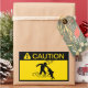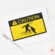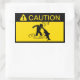 Yellow and black caution sign with a fish trying to eat a stick figure.