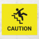 Let everyone know that you are clumsy and prone to falling down stairs with this black icon image of a person falling down a set of stairs. The word caution in uppercase black font. Set on bright safety yellow.