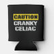 Funny can cooler with a warning sign saying CAUTION CRANKY CELIAC. Great gift for Celiacs.