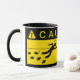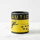 Yellow and black caution sign with piranhas chasing a stick figure.