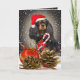 Beautiful black and brown Cavalier King Charles is a Christmas Card design that features King Charles decked in Santa hat with large candy cane against backdrop of night skies and white snow.
