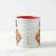 The mug has a design of a cute Cavalier King Charles Spaniel dog wearing a Santa hat. The background of the mug is covered in a repeating pattern of the words "woof". The image is bright and cheerful, and it would be perfect for a Christmas-themed gift.