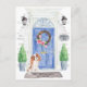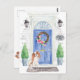 Announce your new address with our stylish announcement featuring a Cavalier King Charles Spaniel, blue front door, welcome mat, slate sign, topiaries and a floral wreath set on a grey brick background.