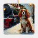 A nostalgic and heartwarming Christmas painting of a Cavalier King Charles Spaniel waiting at a snowy train station. Perfect for those who love vintage holiday charm and timeless festive art.