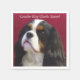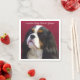 This is a red cocktail napkin featuring an original photograph of a Tri-Colour Cavalier King Charles Spaniel, with a soulful expression, and the text "Cavalier King Charles Spaniel"