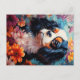 A close-up portrait of a tricolor Cavalier King Charles Spaniel puppy, rendered in a painterly style. The dog has a white, black and brown coat, with large, expressive brown eyes. It is surrounded by a profusion of colorfull flowers, creating a soft and romantic atmosphere. The dog's fur is depicted with meticulous detail, capturing the texture and flow of its long, silky hair. Perfect gift for cavie lovers.