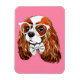 This design features a portrait of a Cavalier King Charles Spaniel wearing glasses and a bow tie on a pink background.