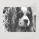 Black and white, close up portrait photograph of a beautiful, soulful King Charles Spaniel.