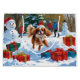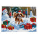 A cheerful Cavalier King Charles Spaniel runs through the snowy winter scene, wearing a festive red Christmas hat. This charming design highlights the breed’s silky ears, gentle nature, and playful personality while capturing the warmth and joy of the holiday season. A heartwarming winter moment full of festive cheer.