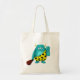 Little teal coloured cartoon monster with horns and blue eyes, wearing a yellow and black loincloth, carrying a wooden club in one hand and waving with the other.