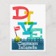 Colourful Cayman Islands Caribbean scuba design. Retro typography in inkpress style with the word "Dive", along with a scuba flag floating in the ocean.