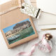 Rectangular photo sticker with two boats in the old small port of Cefalu, an old town with crooked houses on the waterfront and a small city beach on the north coast of Sicily, island in Italy.