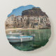 Round throw pillow with two boats in the old small port of Cefalu, an old town with crooked houses on the waterfront and a small city beach on the north coast of Sicily, island in Italy.