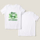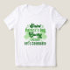 The image shows a person wearing a white T-shirt with green text and shamrock graphics. The text on the T-shirt reads: "Saint Patrick's Day Lucky Irish let's Celebrate." This image is relevant as it depicts festive apparel commonly worn during Saint Patrick's Day celebrations, highlighting themes of luck and Irish heritage.