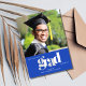 Stylish blue photo design graduation announcement and party invitation. Customise with your senior photo, name and the name of their school. Add your graduation party details to the backside of the card and mail out to family and friends to invite them to celebrate the graduate.