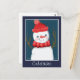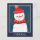 Digitally coloured snowman in red striped scarf and red knitted hat. There is a small heart shape on his branch. Adjustable text options on front and back of card. Artwork by Valarie Wade.