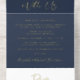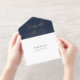 Elegant dark blue elopement or private wedding announcement and reception all-in-one invitation featuring "Celebrate With Us" in a chic script and your marriage announcement and reception invitation, all rendered in your choice of genuine gold, silver or rose gold foil. A white tear-away RSVP postcard provides a convenient and envelope-free response option for your guests.