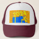 Celebrate the year 2024 in style with this custom Trucker Hat featuring a vibrant gift box design and a yellow background. The white front panel and maroon mesh back give a classic and festive colour combination. Perfect for parties, events, or everyday wear, this hat adds a fun, personalised touch to your look!