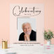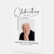 Modern memorial funeral acrylic sign features the wording 'Celebrating the Life of', your loved one's photo, their name, and their birth/death dates. MATCHING items in our collection.