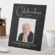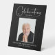 Modern memorial funeral pedestal sign features "Celebrating the Life of" in chic lettering with your loved one's photo, name & dates on a black background. MATCHING items in our collection.