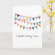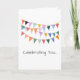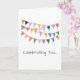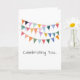 Artisan Party Banner Flags in multi colors on white background with custom CELEBRATING YOU... in gray, HAPPY BIRTHDAY in gray on inside. Great for ANY person, pet, birthday party. Colorful, Timeless, Fun. Mix and match entire Greeting Card / Birthday Collections.