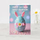 This card features a smooth, robin’s egg blue egg-shaped centerpiece topped with upright bunny ears that are white-tipped and softly lined in pink 🐰. Tiny candy-like dots and small star shapes in pale pink, white, and buttery yellow are sprinkled across the surface, giving it a sweet, sprinkled look. A shiny pink ribbon wraps around the middle and is tied into a neat bow, suggesting a gentle, gift-like gesture between close friends. Tucked into the bow is a white daisy with a golden centre, like a small floral note left with quiet affection 🌷. Along the bottom, a few round pastel treats are scattered on a blush-pink surface, echoing the same soft colour palette. The background fades upward into light sky blue with large, softly blurred circles of rose, lavender, and deep blue light, creating a dreamy glow. Near the top, short greeting text sits centred in white, standing out against the blue. The bunny ears angle slightly inward above the egg shape, with the pink inner edges clearly visible.
