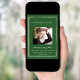A forest green coloured background, a faux silver frame . Personalise and add a photo, name, dates and your text. White text.
