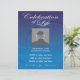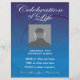 Custom Photo Memorial Celebration of Life invitation flyer on beautiful blue background with swooping circles. Fully customisable with your date, time, place, etc. Replace "custom photo here" template with your own photo of the person being honoured. A celebration of life event is a wonderful way to share memories and pay tribute to a family member or friend, either in addition to, or instead of, a traditional funeral service.