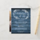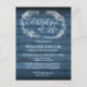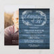 A rustic celebration of life remembrance invitation postcard featuring a hand-drawn foliage garland on a blue wood panels background and photo on the reverse. Designed by Thisisnotme©